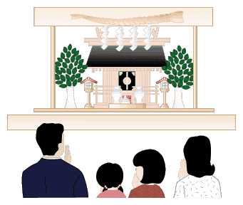 朝、出かける前や帰ってきたとき、夜寝る前などに、お父さんやお母さんにするように、神さまやご先祖さまにもあいさつをしましょう。神棚と御霊舎に手をあわせて、毎日元気でいられることや、楽しく過ごせることへの祈りと感謝を捧げましょう。